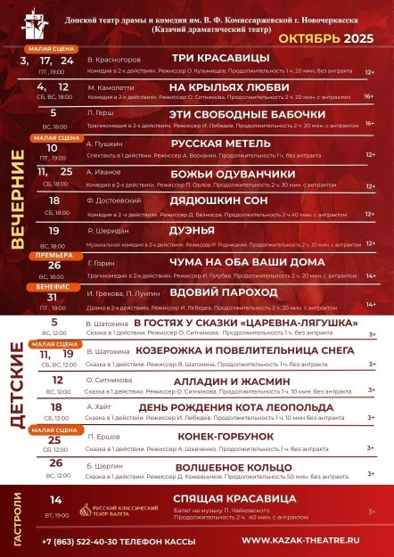 Уважаемы жители Новочеркасска и гости города!!! Предлагаем вашему вниманию афишу Казачьего драматического театра на октябрь.